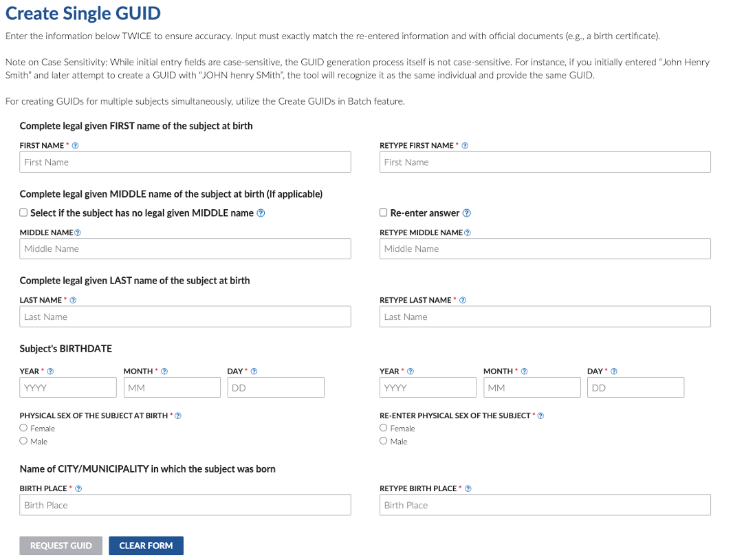 If you know that the participant has no legal middle name on their birth certificate, the tool allows you to specify that the person has no middle name. If you do not have the middle name, or if you do not know whether they have one, you cannot create a GUID. -