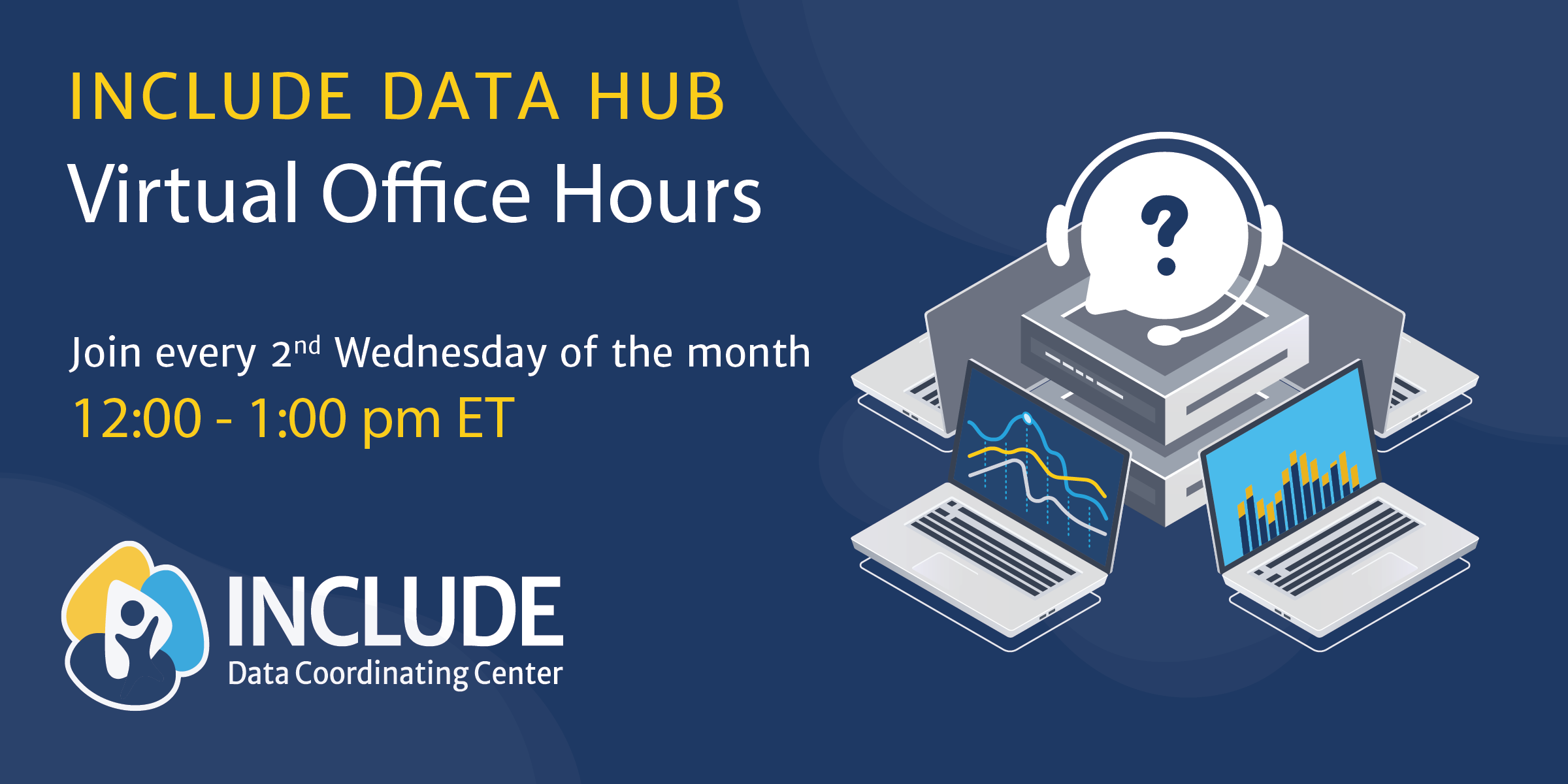 The INCLUDE Data Coordinating Center will host its office hours on the second Wednesday of each month from 12:00 to 1:00 pm ET.